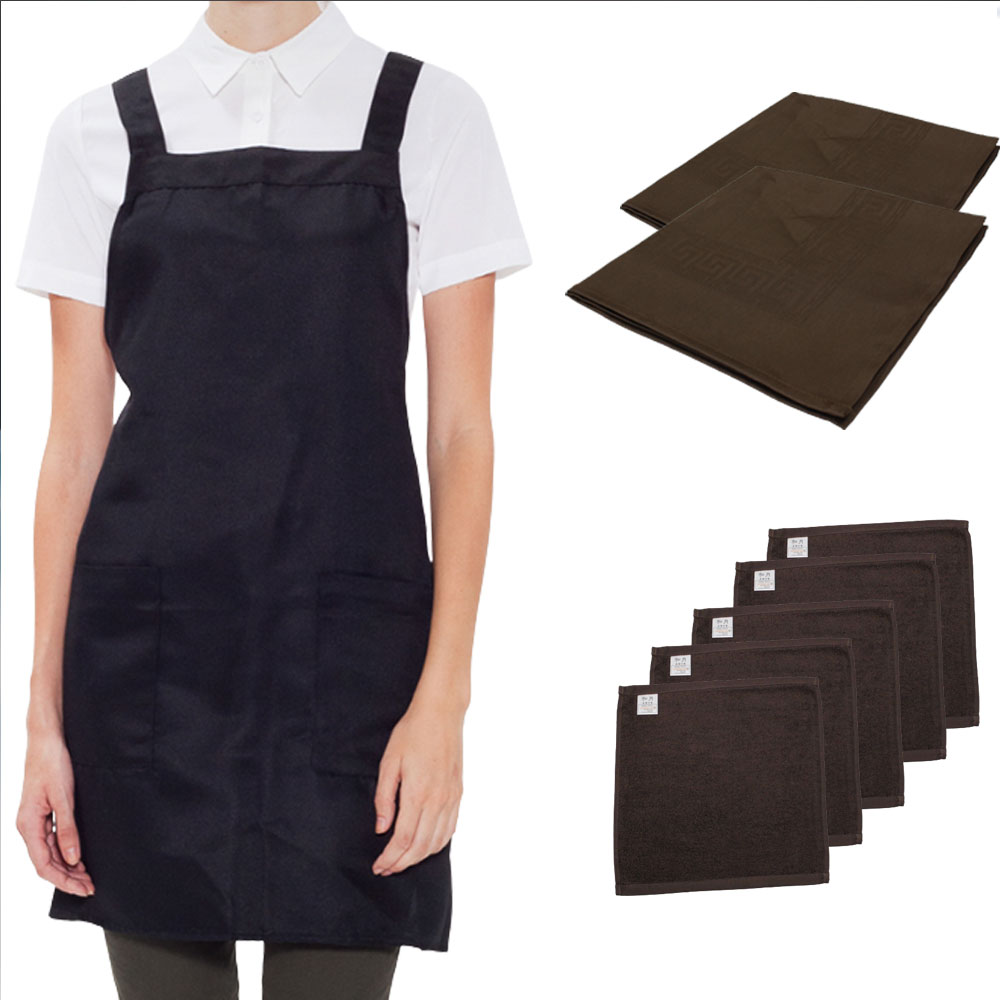일상복처럼 편하고 깔끔하게 보일 수 있는 복장으로 준비했어요. 앞치마, 모자, 린넨 행주 등